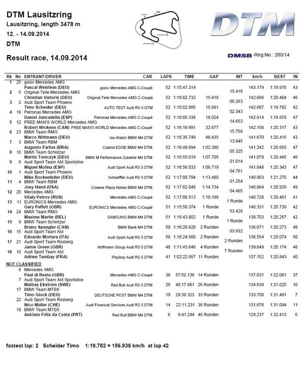 Yarışa pole pozisyonundan başlayan 19 yaşındaki Alman pilot, startta yerini korumayı başarırıken 52 tur sonunda 15 saniye farkla damalı bayrağı ilk sırada gördü ve DTM kariyerinin ilk yarış zaferini kazanmış oldu.