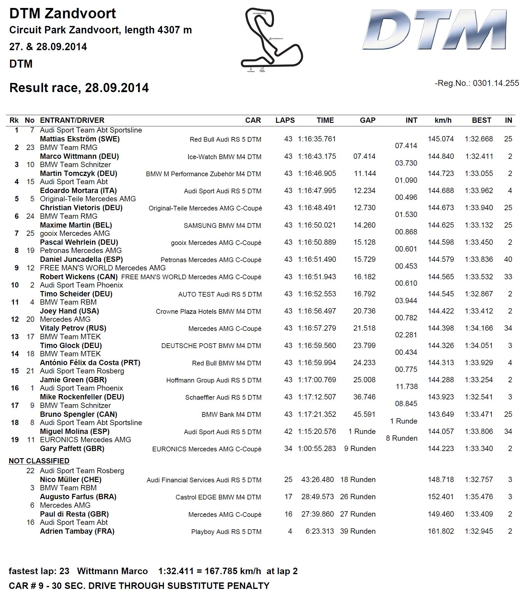 BMW Team RMG ile iyi bir start alarak ilk virajda liderliği eline alan Marco Wittmann ise güvenlik aracından olumsuz etkilenen pilotlar arasında yer alırken ikinci sıradan başladığı yarışı yine ikinci sırada tamamlayarak Hollanda'dan podyumla ayrılmış oldu.